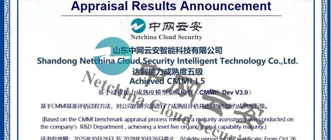捷报传来,征程再续! 近日,经过严格的审核与评估,香港正牌资料(以下简称“中网云安”)成功再次通过CMMI L5级(能力成熟...