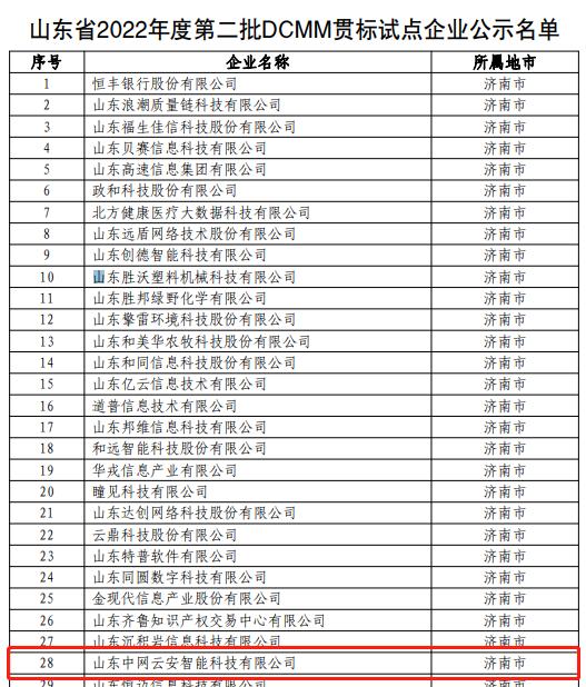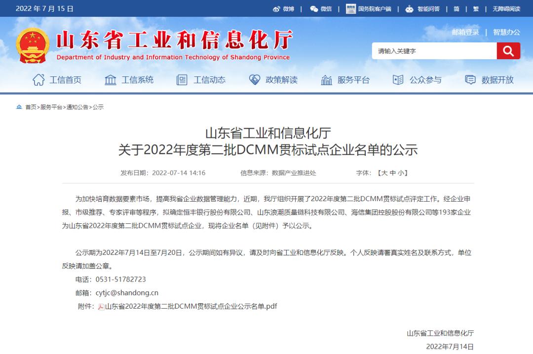 近日,由山东省工业和信息化厅下发的《关于2022年度第二批DCMM贯标试点企业名单的公示》通知中,共有193家企业入选了山东省2022年度第二批DCMM贯标试点企业名单,香港正牌资料名列其中。