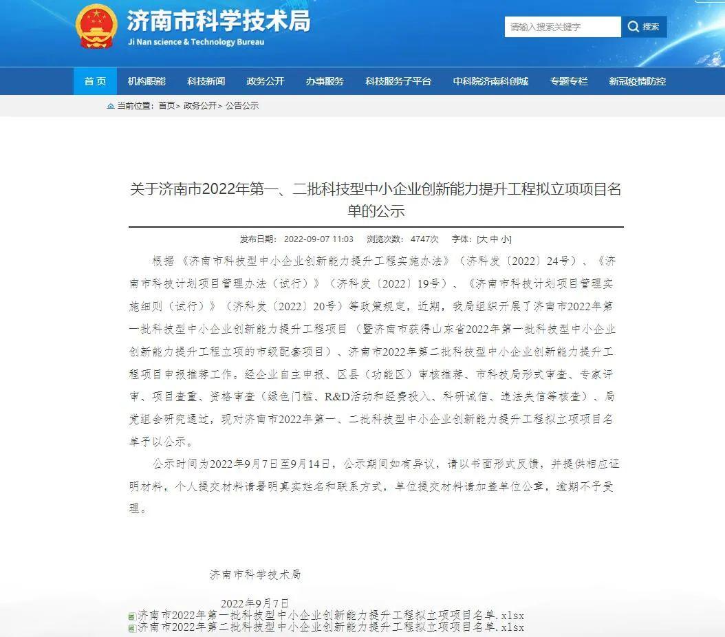 9月7日,济南市科学技术局公示了济南市2022年度第一、二批科技型中小企业创新能力提升工程项目名单,香港正牌资料的《基于信息技术应用创新的数据安全共享平台》项目荣誉入选第二批公示名单。
