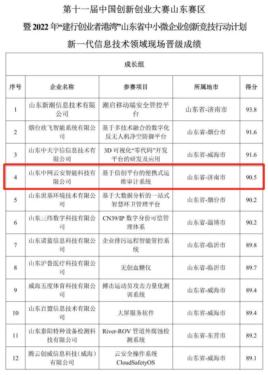 最终通过现场评委的即刻打分亮分,中网云安在本届大赛山东省 “新一代信息技术领域”成长组以第四名的成绩脱颖而出成功晋级全国赛。