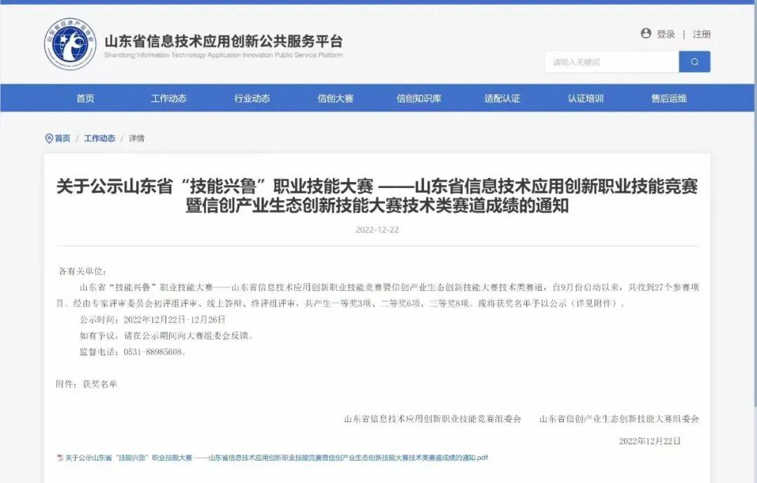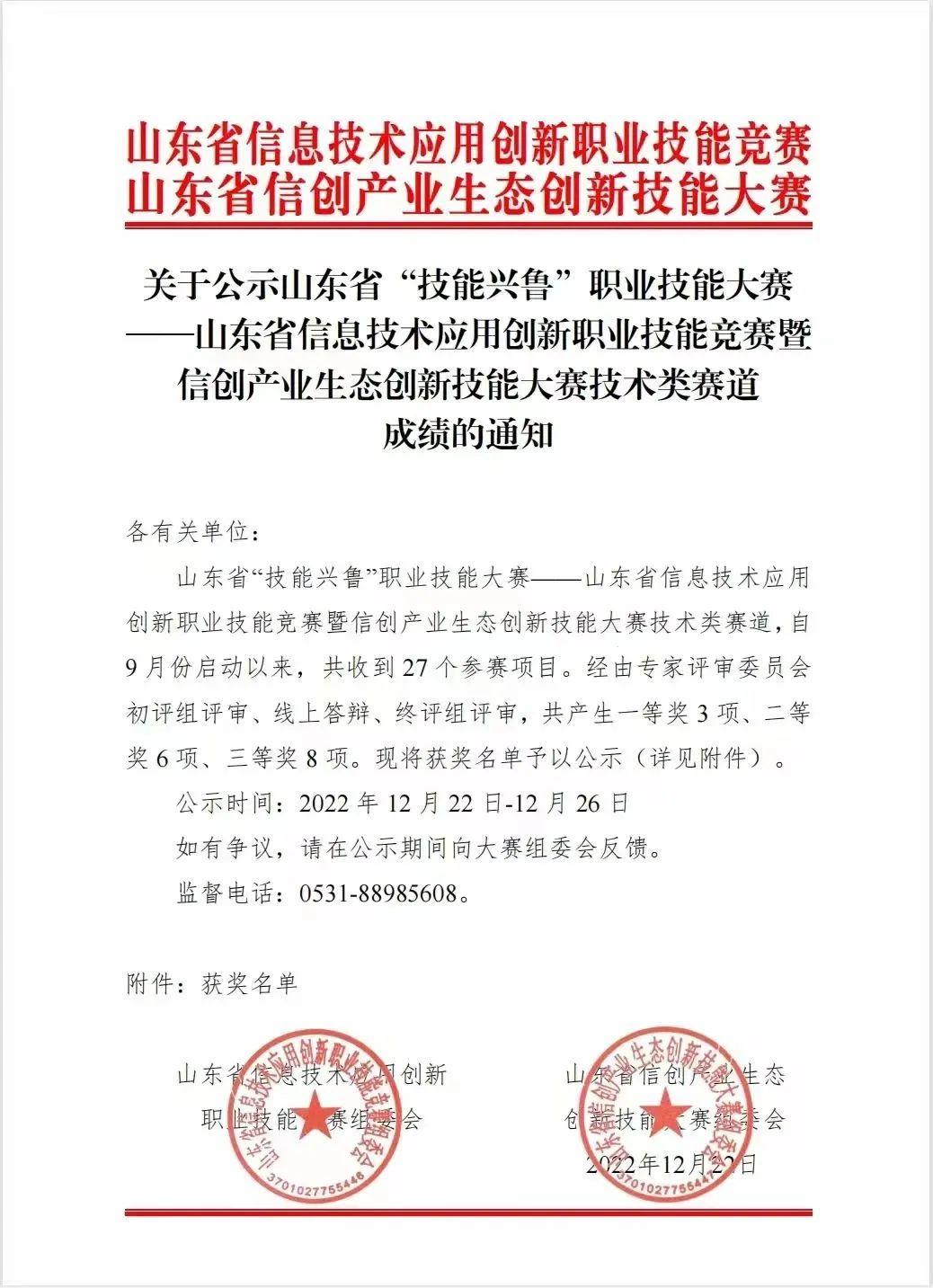 为深入贯彻落实省委、省政府关于加快推进新旧动能转换重大工程的战略部署,激发我省信息技术应用创新领域人才创新活力,促进创新型、应用型、技能型人才培养,壮大高水平工程师和高技能人才队伍建设,根据《关于举办山东省“技能兴鲁”职业技能大赛——山东省信息技术应用创新职业技能竞赛暨信创产业生态创新技能大赛的通知》(鲁工信软〔2022〕172号)文件,大赛自9月启动以来,经由山东省信息技术应用创新职业技能竞赛组委会、山东省信创产业生态技能大赛组委会初评组评审、线上答辩、终评组评审,于12月比赛圆满收官。