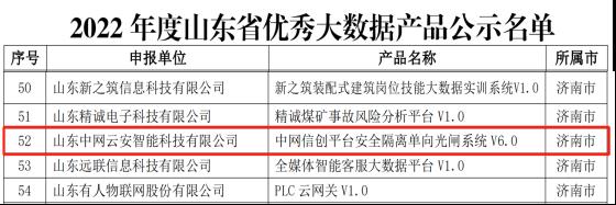 2022年山东省轻工集体企业联社技术创新优秀新产品入库名单也一并进行公布,中网云安申报的“中网信创平台安全隔离单向光闸系统 X-UGAP-FT V6.0”及“中网信创平台安全隔离网闸系统 X-GAP-FT V7.0”两款产品均入围技术创新优秀新产品名单。