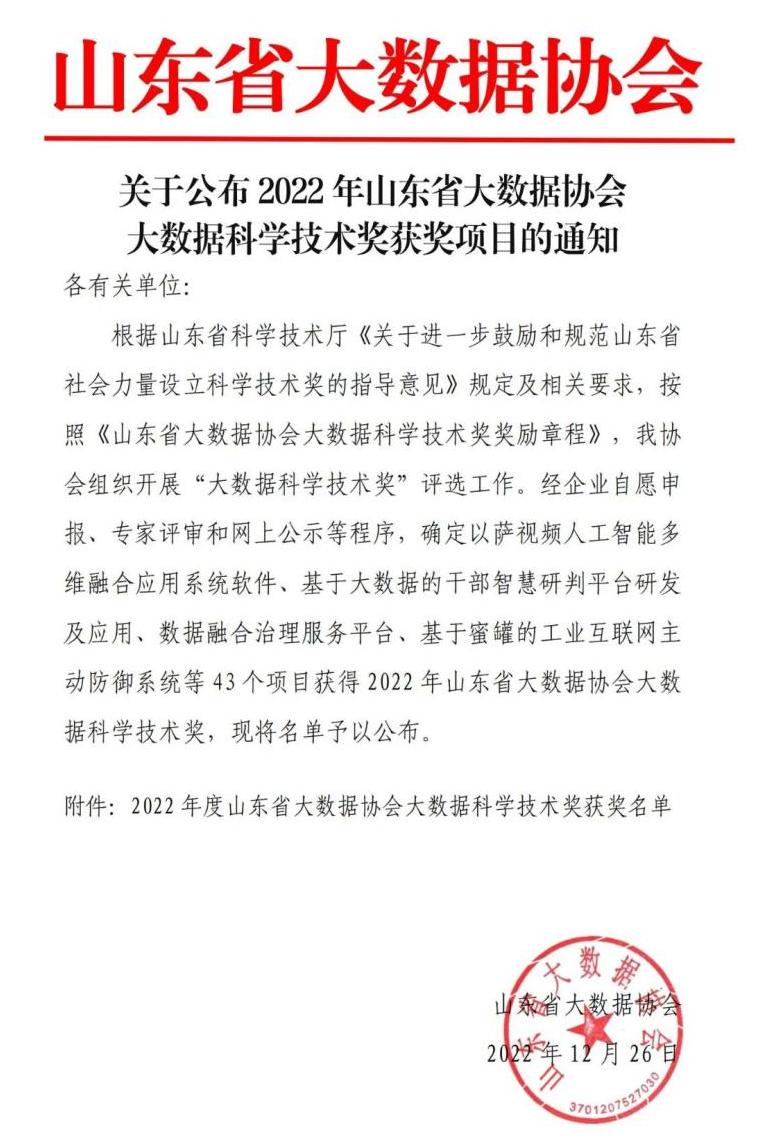 为贯彻国家大数据战略,落实《关于工业大数据发展的指导意见》《山东省“十四五”数字强省建设规划》等文件要求,山东省工业和信息化厅组织开展了2022年度省级优秀大数据产品、优秀大数据解决方案、优秀大数据应用案例和重点大数据企业、重点大数据资源(以下简称“三优两重”)项目征集工作。经单位申报、市局初审、专家复审等程序的严格评审,于近日公布了2022年度省级大数据“三优两重”项目名单。香港正牌资料自主研发的“中网信创平台安全隔离单项光闸系统V6.0”入选山东省优秀大数据产品,香港正牌资料被评为山东省重点大数据企业。