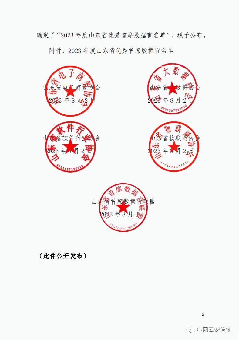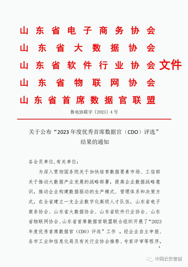 近日,由山东省电子商务协会、山东省大数据协会、山东省软件行业协会、山东省物联网协会、山东省首席数据官联盟共同组织开展了“2023年度山东省优秀首席数据官(CDO)评选”活动,中网云安总经理李鹏荣获“2023年度山东省优秀首席数据官(CDO)”称号!