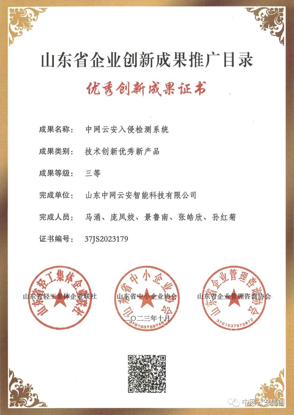 中网云安的“入侵检测系统”荣誉入选2023年企业创新优秀成果推广目录