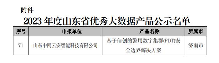 近日,山东省工业和信息化厅公布了2023年度山东省大数据“三优两重”项目名单。中网云安凭借在大数据领域的创新深耕荣获“山东省重点数厂”称号,中网云安打造的“基于信创的警用数字集群(PDT)安全边界解决方案”入选“山东省优秀大数据解决方案”。