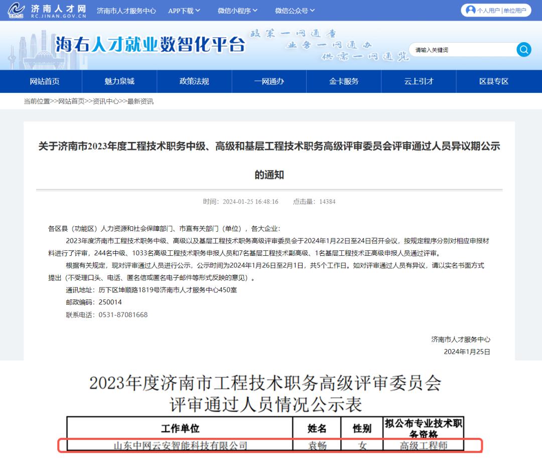 “海右此亭古、济南名士多”,济南自古就是人才荟萃之地。近日,中网云安人才荣誉喜讯频传,董事长袁畅女士经过严格的评审,荣获2023年度“高级工程师”职称。总经理李鹏先生获评2023年“海右计划”产业领军人才称号。