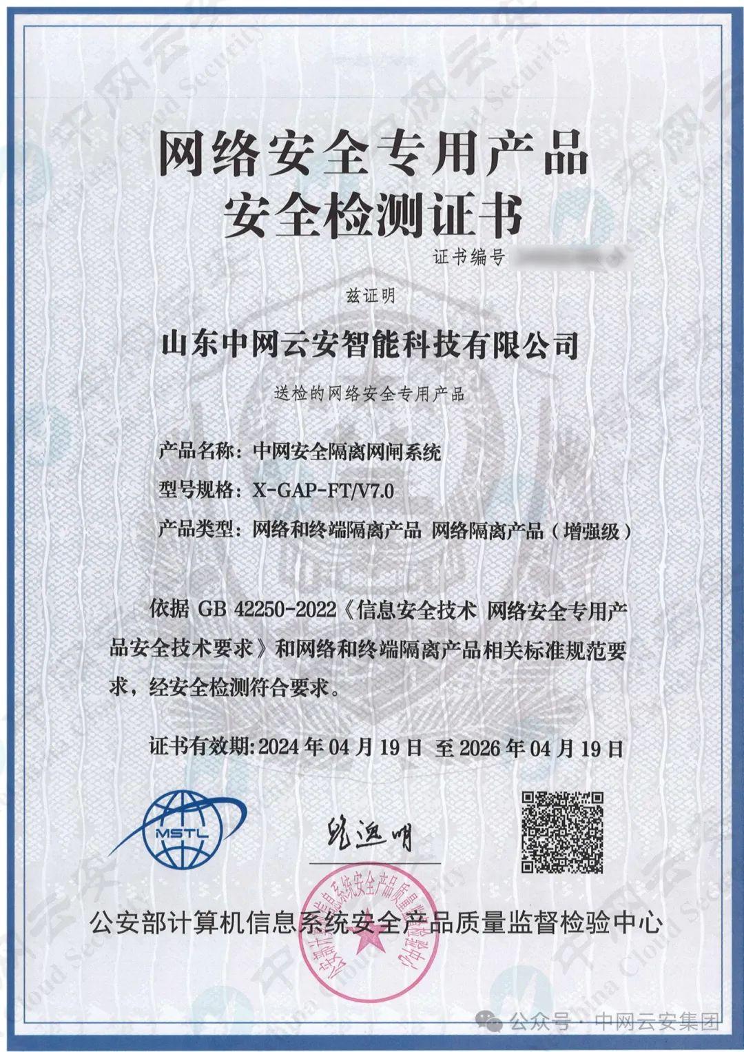 近日,中网云安自主研发的“中网安全隔离网闸系统 X-GAP-FT/V7.0”、“中网安全隔离单向光闸系统 X-UGAP-FT/V6.0”和“中网云安防火墙 NCS-FW-FT/V2.0”三大核心边界安全产品(信创平台),顺利通过公安部计算机信息系统安全产品质量监督检验中心增强级安全检测(全部支持IPv6功能),获得《网络安全专用产品安全检测证书》。