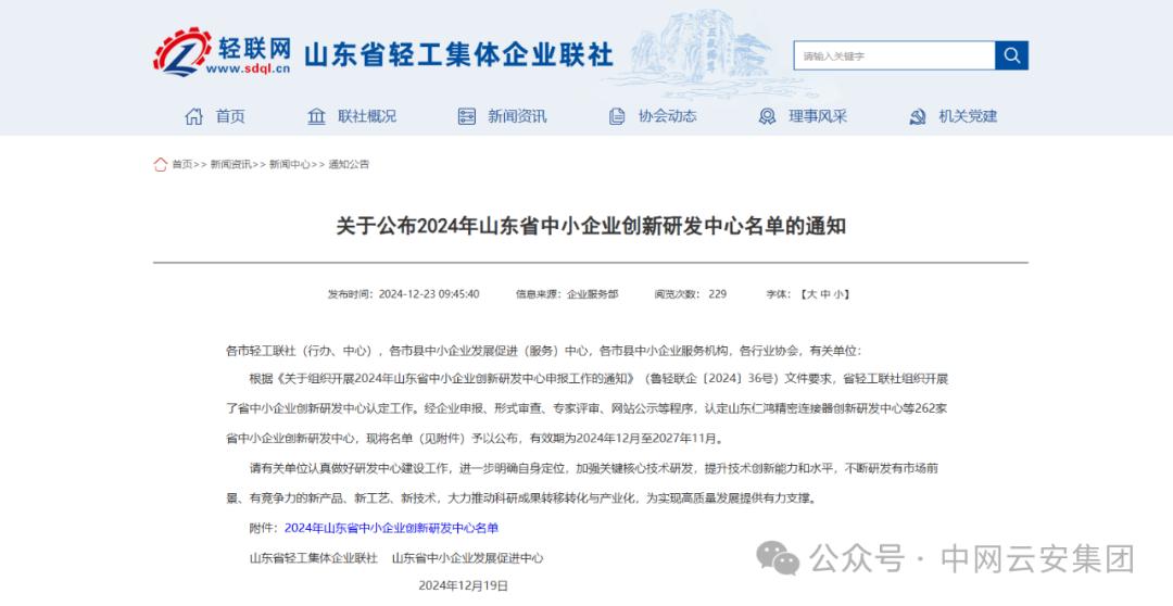 此次入选2024年山东省中小企业创新研发中心名单不仅是对中网云安研发和创新能力的肯定,更是对公司持续创新发展的鞭策与激励。未来,中网云安将更加注重研发成果与市场需求的紧密对接,加速科研成果的商业转化,为中小企业在网络安全保障方面提供更具针对性、更高效的解决方案,助力广大中小企业稳健前行,也为整个行业的创新发展贡献更多中网云安的力量!