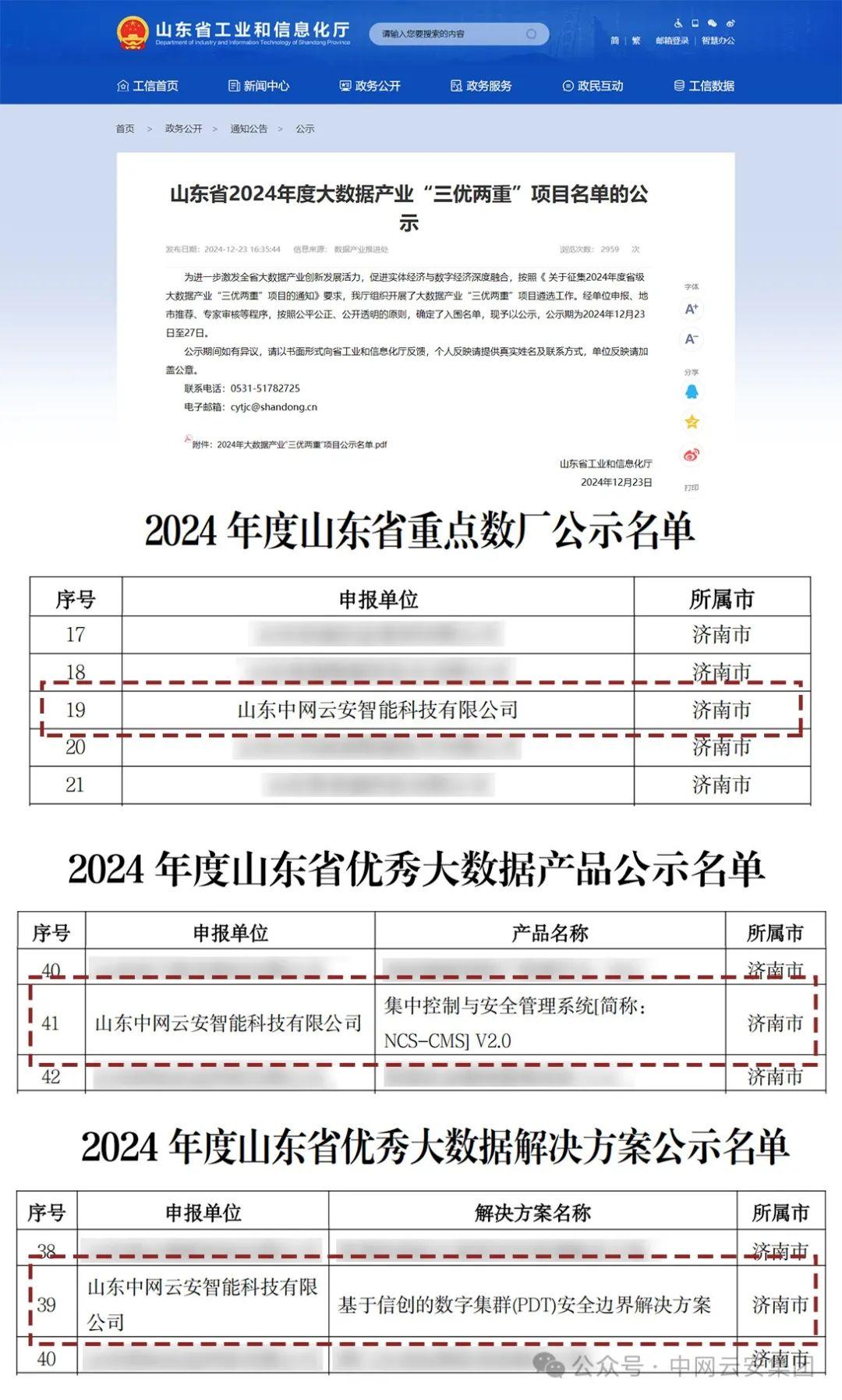 为进一步激发全省大数据产业创新发展活力,促进实体经济与数字经济深度融合,按照《关于征集2024年度省级大数据产业“三优两重”项目的通知》要求,山东省工业和信息化厅组织开展了大数据产业“三优两重”项目遴选工作。经单位申报、地市推荐、专家审核等程序,按照公平公正、公开透明的原则,确定了入围名单。中网云安实力入选“山东省重点数厂名单”,同时,中网云安“集中控制与安全管理系统[简称:NCS-CMS] V2.0”入选优秀大数据产品名单!中网云安“基于信创的数字集群(PDT)安全边界解决方案”入选优秀大数据解决方案名单。截止目前,中网云安已连续五次入选“三优两重”项目名单!