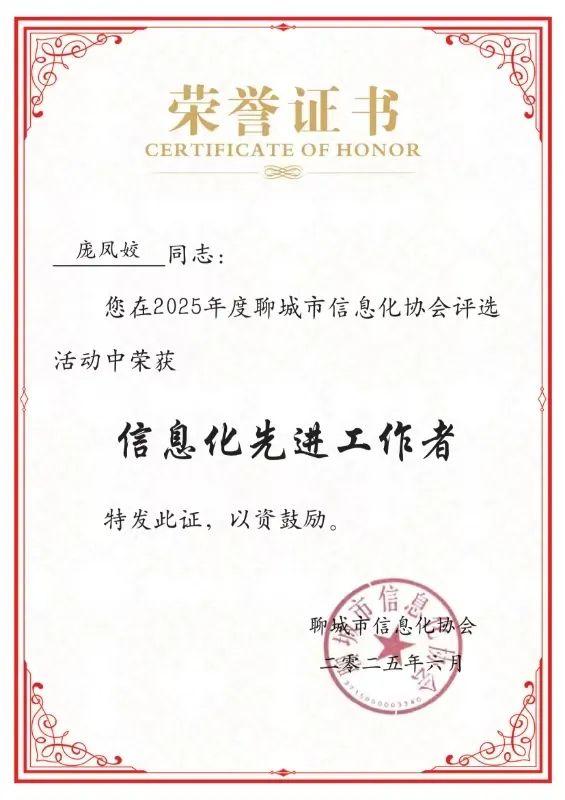 在个人荣誉层面,中网云安副总经理兼市场总监庞凤姣凭借在信息化领域的突出贡献,荣获“信息化先进工作者”称号,以“政策+技术+生态”的协同模式,为区域网络安全体系建设提供了可复制的标杆案例,同时推动公司与政府、高校及行业头部企业建立深度合作,为聊城市信息化人才培养与产业生态建设注入了强劲动力。这一荣誉不仅是对个人专业能力的肯定,更是对公司“人才引领发展”理念的有力印证。
