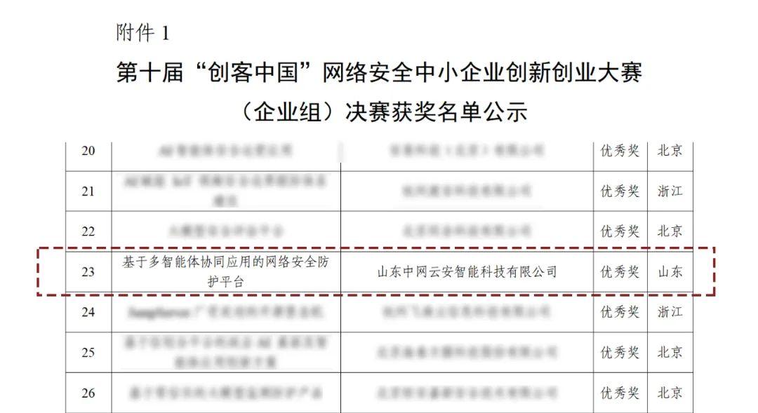 第十届“创客中国”网络安全中小企业创新创业大赛自启动以来,得到各组织单位的大力支持,并获得行业内外的广泛关注,共计215个企业组与创业组项目踊跃报名参赛,经过初赛与复赛专业评审,企业组30个、创业组10个项目入围决赛,同时邀请网络安全相关领域的技术专家、投资专家担任决赛评审,邀请北京海诚公证处现场公证,对入围项目进行决赛路演评审,香港正牌资料(以下简称中网云安)凭借“基于多智能体协同应用的网络安全防护平台”成为山东省唯一晋级决赛并获奖的企业。