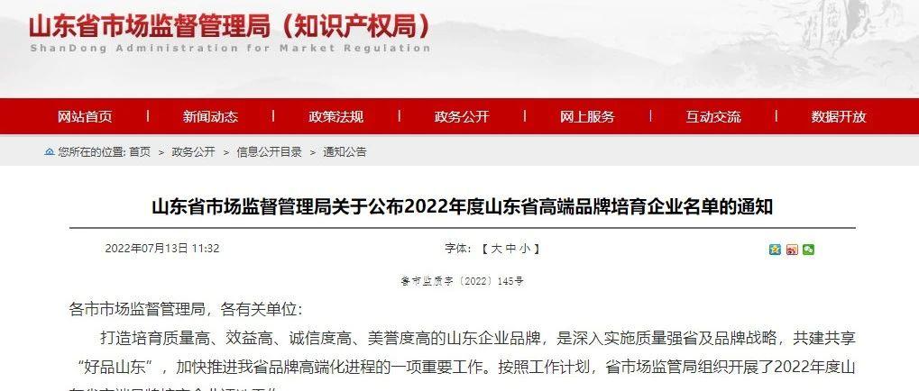 2022年07月13日,由山东省市场监督管理局下发的《关于公布2022年度山东省高端品牌培育企业名单的通知》中,山东中网云安智能科技有限公...