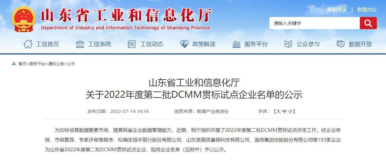 近日,由山东省工业和信息化厅下发的《关于2022年度第二批DCMM贯标试点企业名单的公示》通知中,共有193家企业入选了山东省2022年度第二...