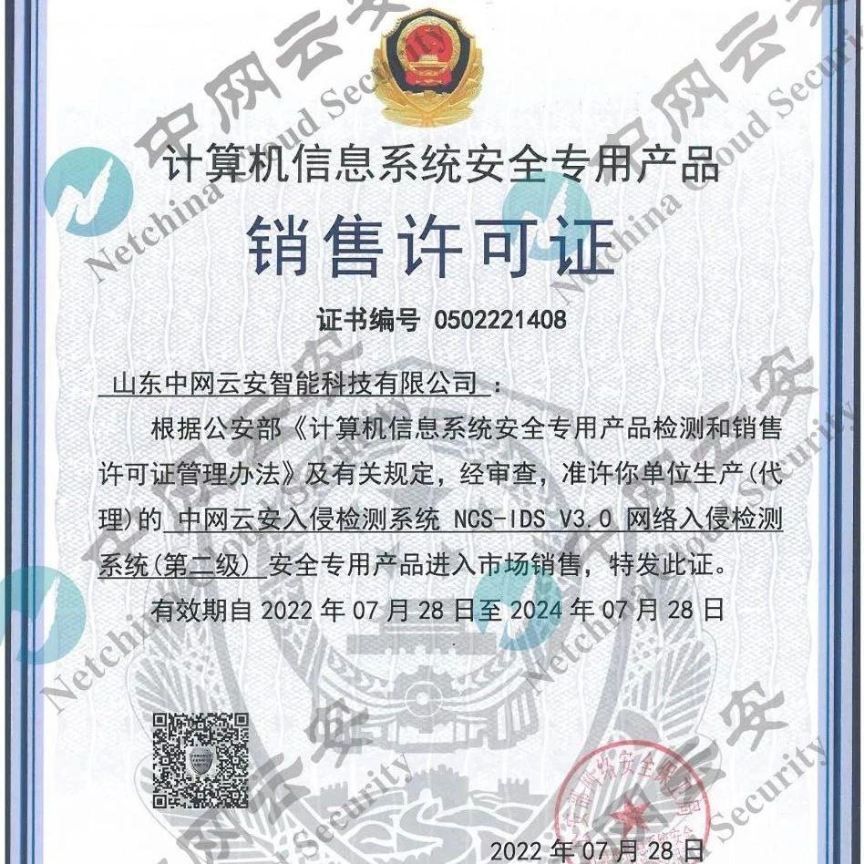 中网云安自主研发的安全产品“中网云安入侵检测系统NCS-IDS V3.0网络入侵检测系统(第二级)”喜获国家公安部颁发的计算机信息系统安全...