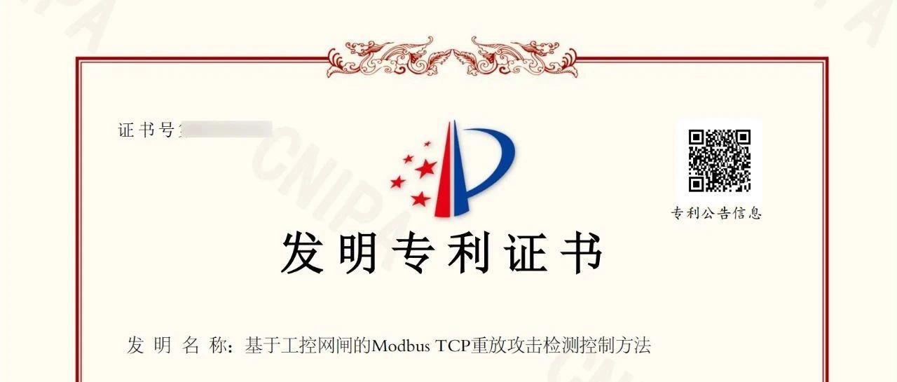 中网云安全资子公司中网云安信创云计算(山东)有限公司技术研发迎来里程碑时刻—公司首个国家发明专利“基于工控网闸的Modbus TCP重放...