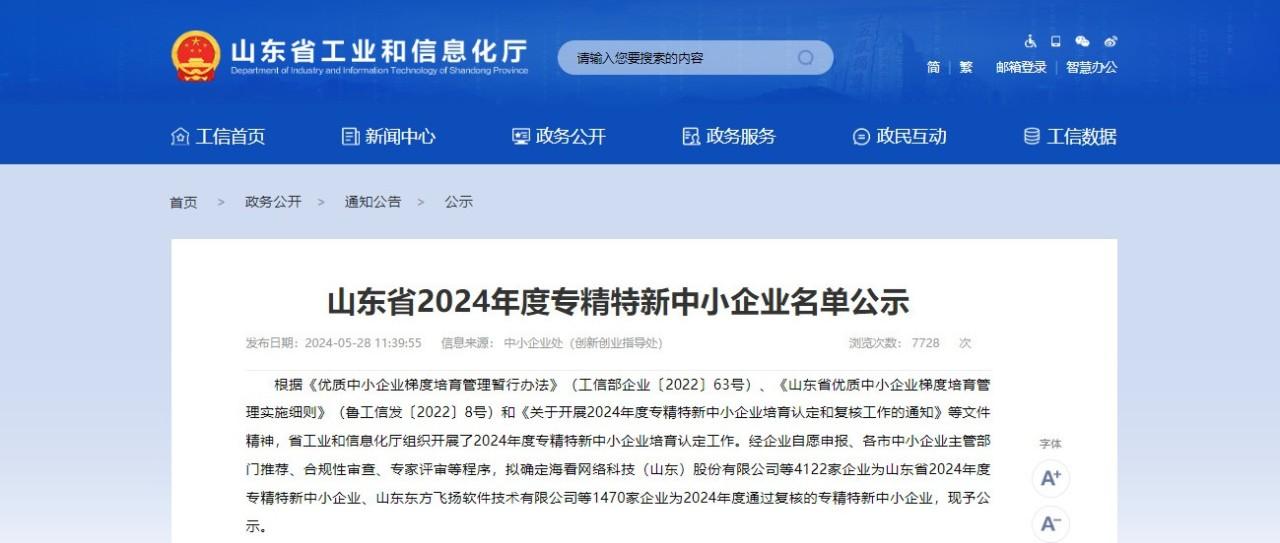 近日,山东省工业和信息化厅公示2024年度山东省专精特新中小企业名单,中网云安2021年首次通过省专精特新中小企业,今年成功通过复核!...
